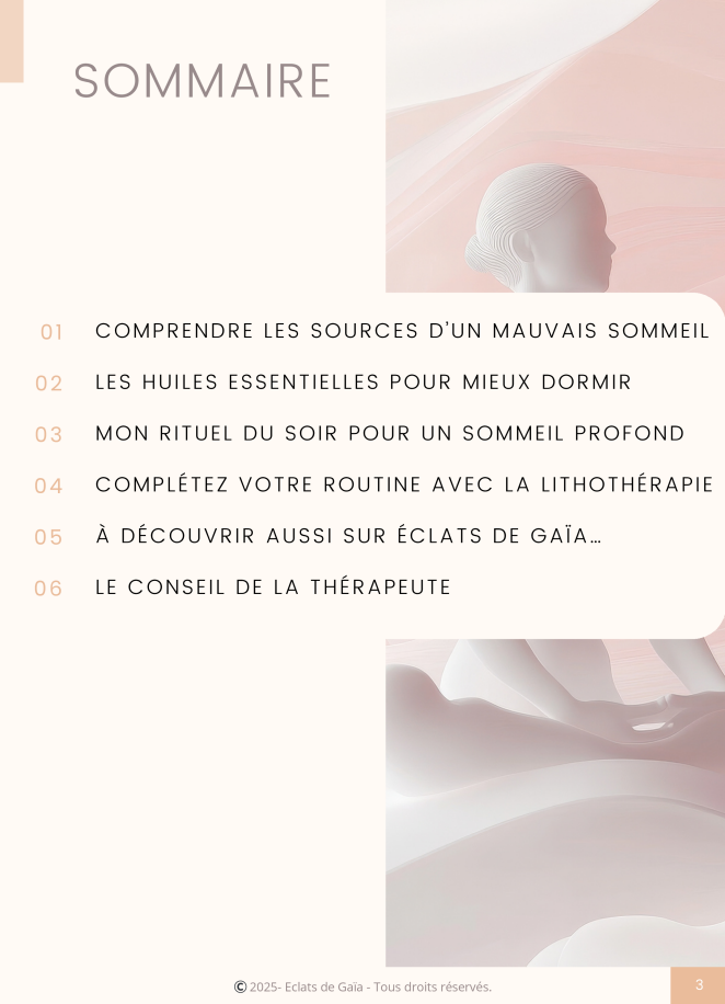 Le guide inclut un rituel complet du soir, associant diffusion, massage, respiration et méditation express pour préparer le corps à un repos profond. Vous découvrirez aussi quelles pierres naturelles peuvent soutenir ce travail, comme l’améthyste, la howlite ou la lépidolite, afin de créer un véritable cocon de détente autour de vous.