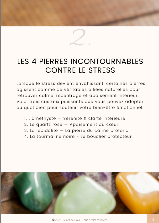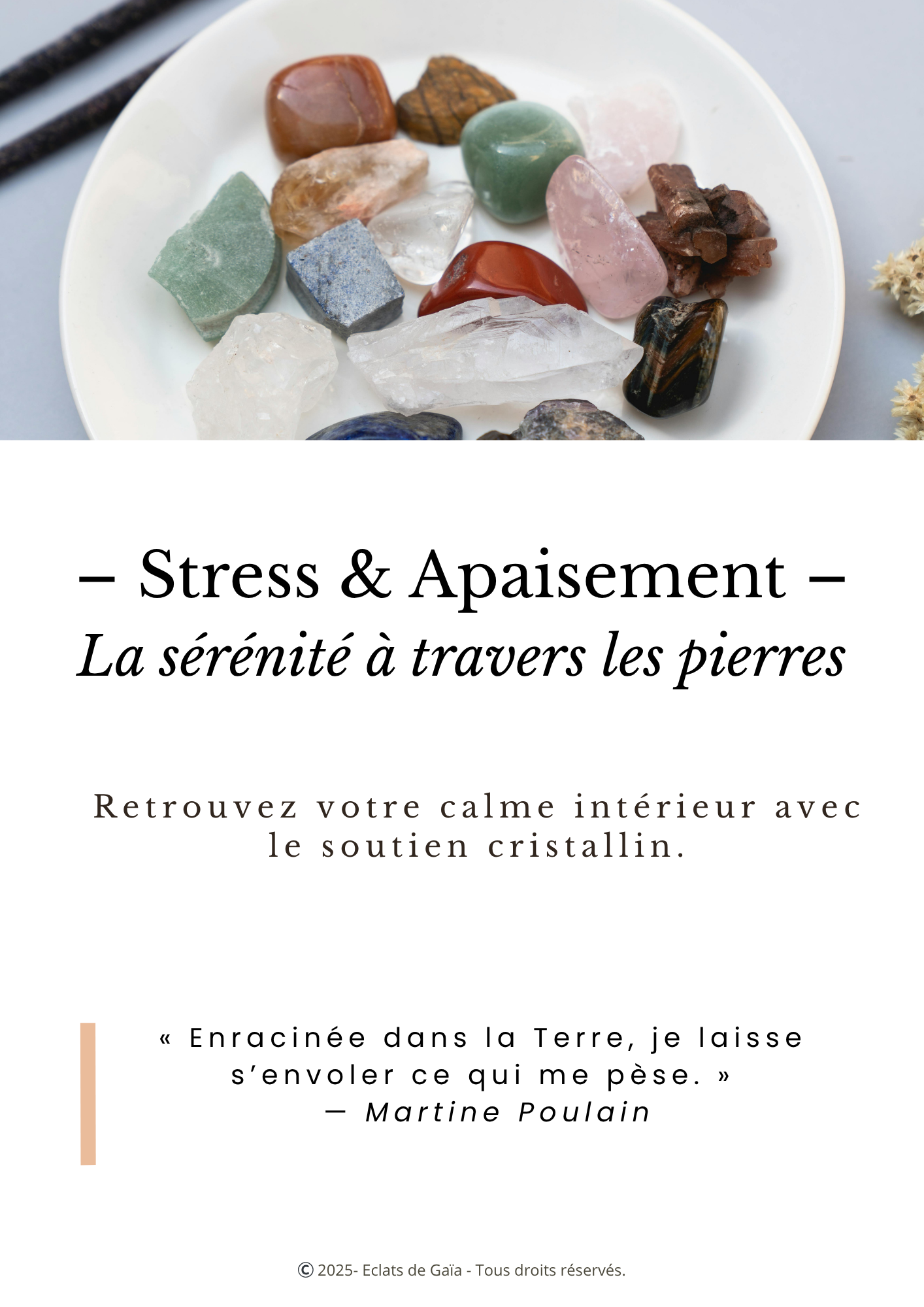 Avec sa dimension douce, pédagogique et profondément humaine, ce guide vous permet de créer votre propre bulle de tranquillité. Les pierres naturelles stress et apaisement deviennent alors des compagnes de route, simples, accessibles et puissantes, pour retrouver votre paix intérieure… à votre rythme.