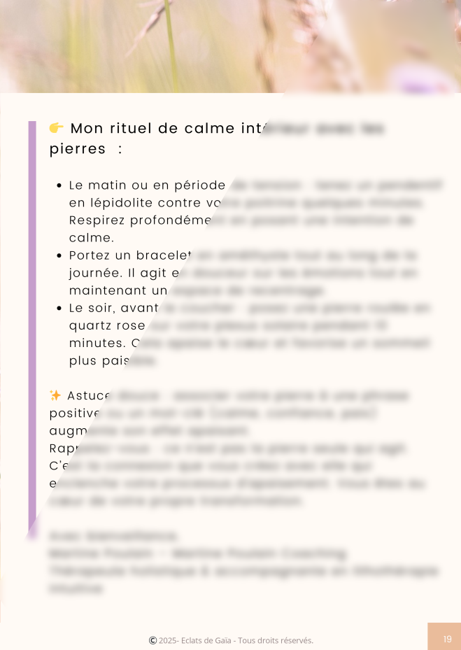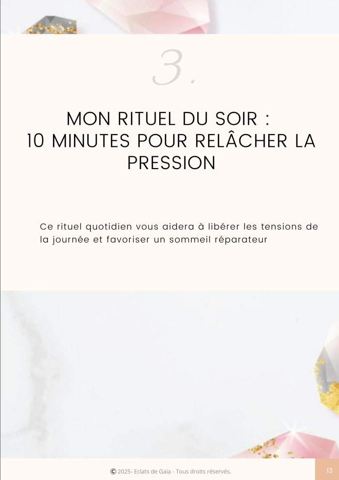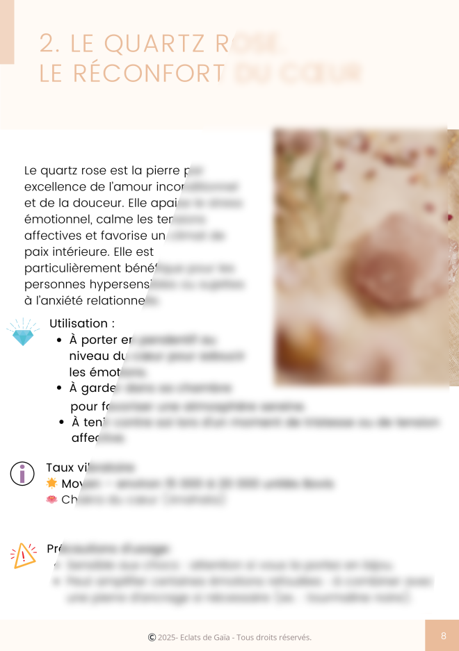 L’ebook inclut également un rituel du soir de 10 minutes pour relâcher la pression, des conseils d’entretien énergétiques, des astuces intuitives et un éclairage thérapeutique pour intégrer les cristaux dans votre routine émotionnelle. Vous découvrirez aussi comment choisir votre “pierre doudou”, celle qui vous apaise instantanément lorsque la journée devient trop lourde.